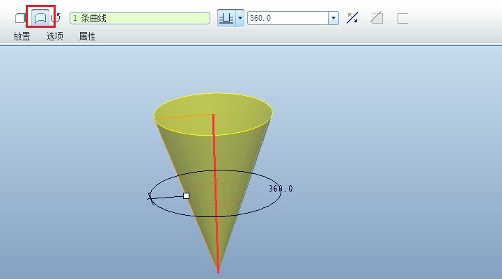 点击旋转命令,类型选择曲面,选择上一步的草绘以及下图红色的旋转轴,如下图所示。