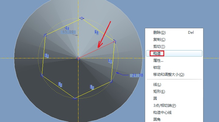 为了创建一个角度尺寸,绘制一条如下的直线,然后将其转为构造线。