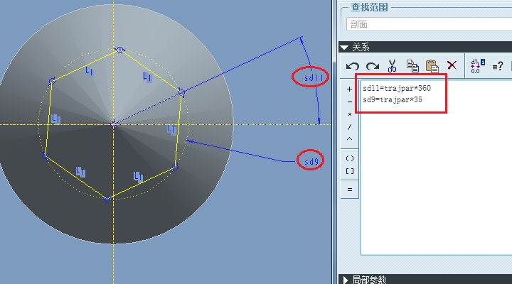 创建下面两个尺寸,点击【工具】-【关系】,添加如下图所示的关系。