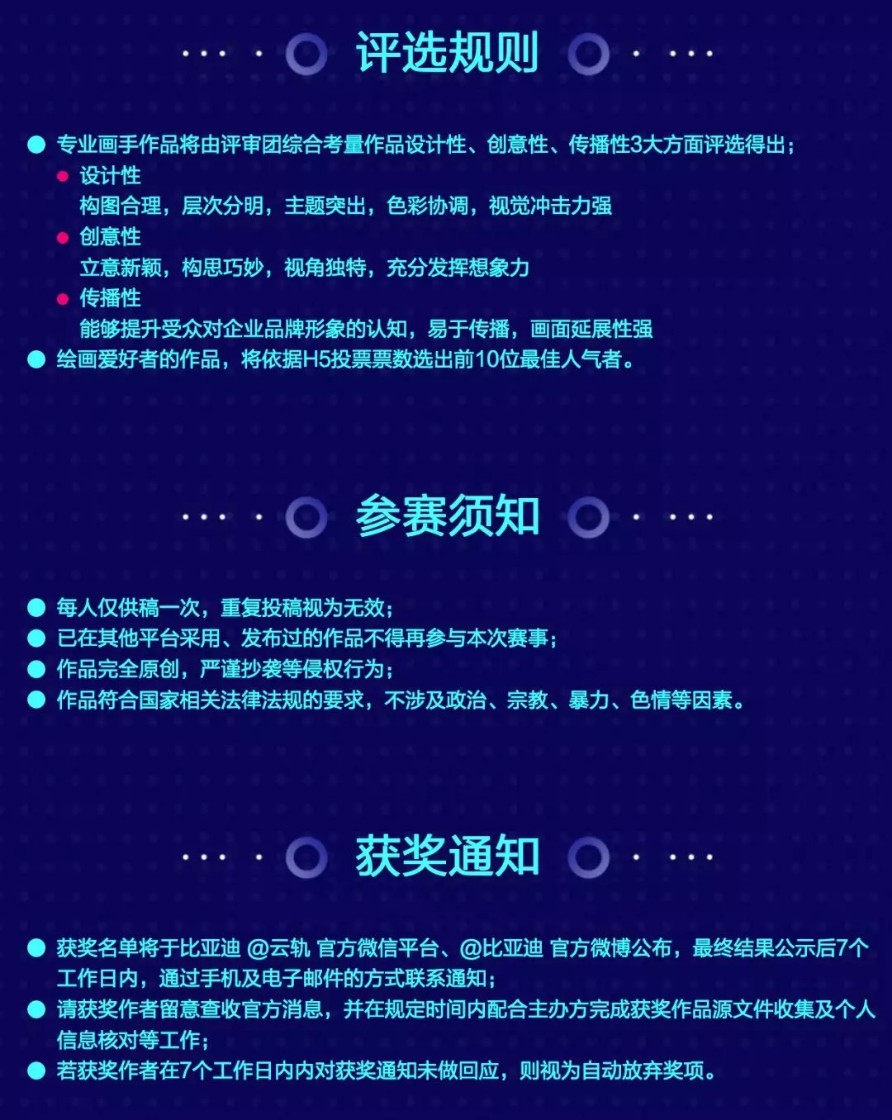 3、带话题#筑梦云端 城就未来#及作品发微博,艾特@比亚迪 @南方都市报@站酷 ,可额外参与大赛有奖征集活动。