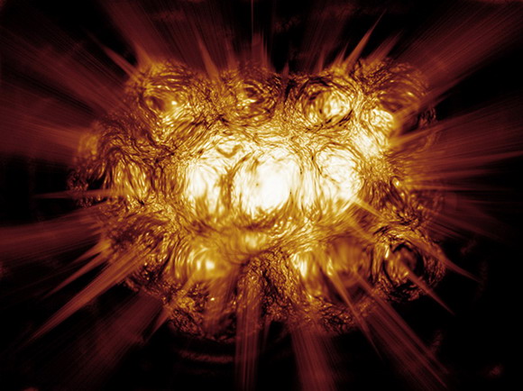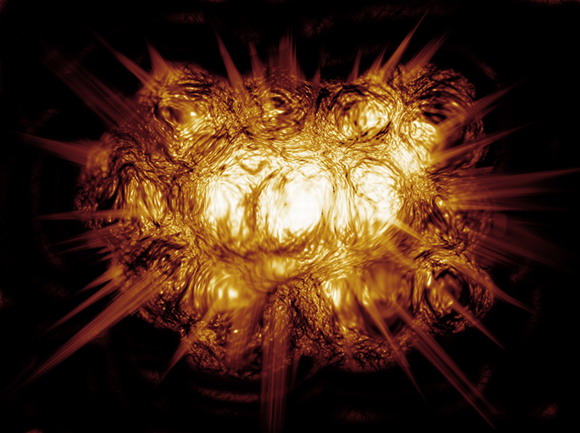 14.如果使用一次觉得不够的话,可以按CTRL F再用一次。这样,爆炸的放射型的辉光效果就更有厚度了。可以在最上面新建一个图层,加些小东西上去如图