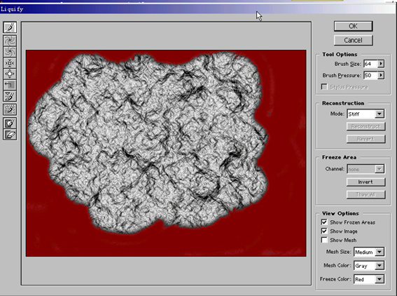8. 按CTRL SHIFT X或菜单Image—Liquify,出现如图所示的面板,面板上预览区里的红色部分是遮罩,表示红色部分是被“保护”而不会被编辑的。