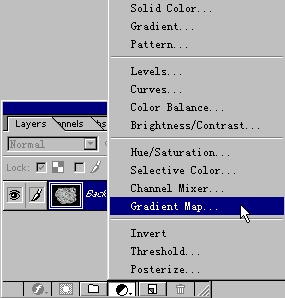 10. 在layer面板上单击下边数起第四个按钮,在拉出的菜单里选择Gradient Map,如图