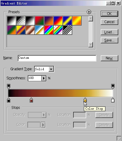 制作一个从左至右为黑、褐、黄、白的渐变映射(Gradient Map的使用方法参见前面火焰的制作方法),给爆炸烟雾加上颜色。如图