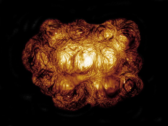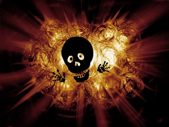 11. 使背景层为当前层,用Dodge tool和Burn tool加工。Dodge工具用来加亮爆炸区中较亮的部位;Burn工具则使爆炸烟雾的边缘部位暗一些。同时可用“手指”工具涂抹加工,使爆炸的形态更逼真,最好再用“水滴”工具将“云彩”的边缘涂模糊些。调整后的结果如图。