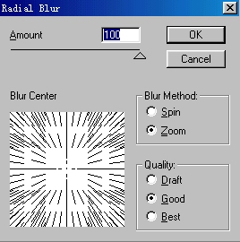 13. 新建一个层,放在Gradient Map调节层下放,随意画上一些白点,接着用Filter—Blur—Radial Blur,将Amount值设为最大,模糊方式选Zoom,即放射型,如图