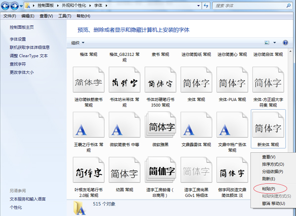 步骤五:然后回到存储字体的文件夹,在空白的位置上右击——粘贴,粘贴之后,所有的字体就会批量安装到电脑上了。