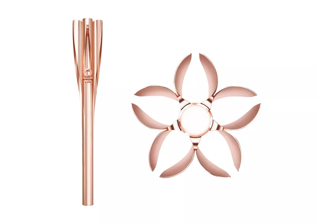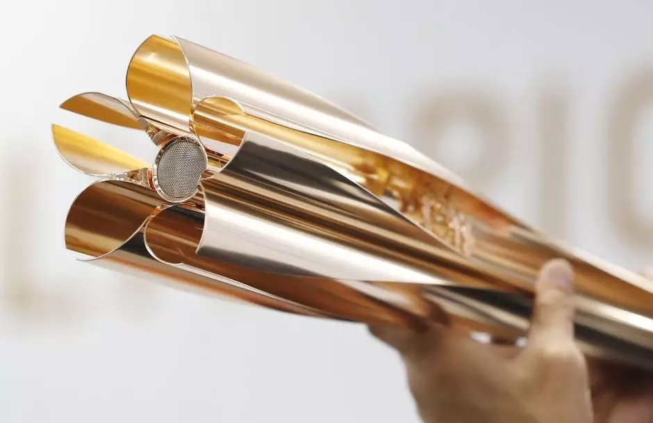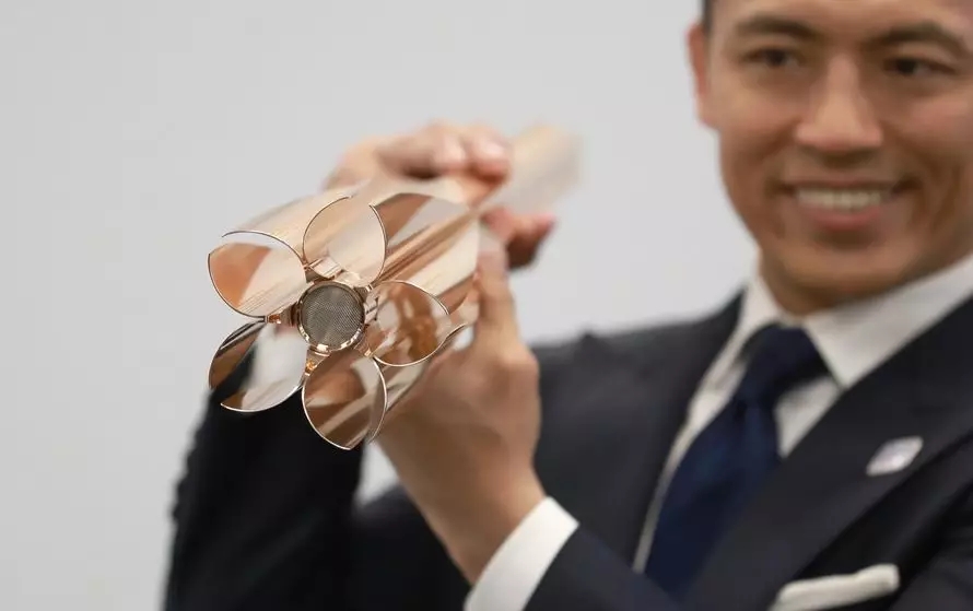 Uniting tradition and modern technology, the shape of the torch resembles that of a Japanese traditional “Sakura-mon“ cherry blossom emblem. It was shaped into this form using the same aluminium extrusion technology used in the manufacture of Japan's famous bullet trains. It forms a seamless, single piece symbolising the Tokyo 2020 Olympic Torch Relay, created by fusing Japanese tradition and modern technology.