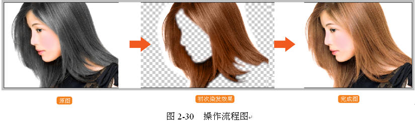 创作思路 首先复制【背景 副本】,使用【添加图层蒙版】对照片中头发之外的图像添加蒙版,然后使用【画笔工具】和【加深 / 减淡工具】对头发进行染发处理,最后利用【曲线】命令进一步调整不同程度的头发色彩。整个实例的操作流程如图 2-30 所示。
