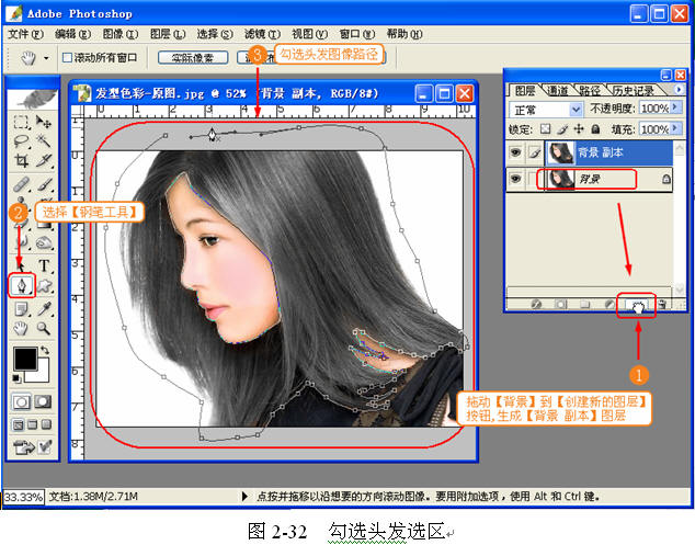 (2) 勾选头发图像选区。首先复制背景图层为【背景 副本】,选择【钢笔工具】勾选出头发部分,如图 2-32 所示。