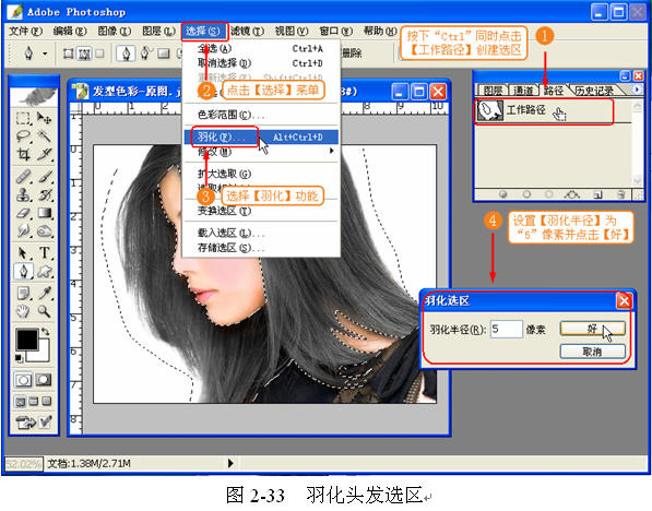 (3) 羽化头发选区。使用【羽化】功能将头发选区进行羽化处理,如图 2-33 所示。