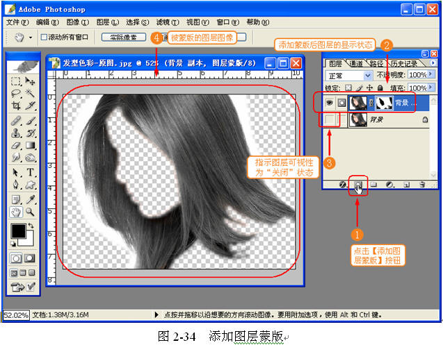 (4) 添加图层蒙版。利用羽化后的选区将【背景 副本】进行添加蒙版,如图 2-34 所示。
