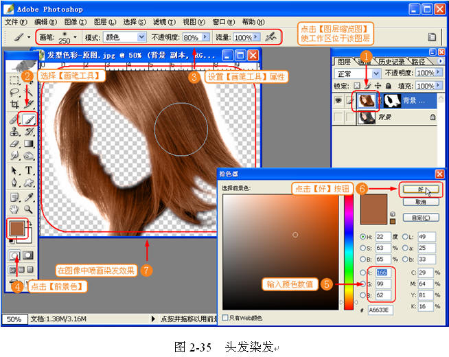 (5) 将头发进行染发。使用【画笔工具】制作染发效果,如图 2-35 所示。