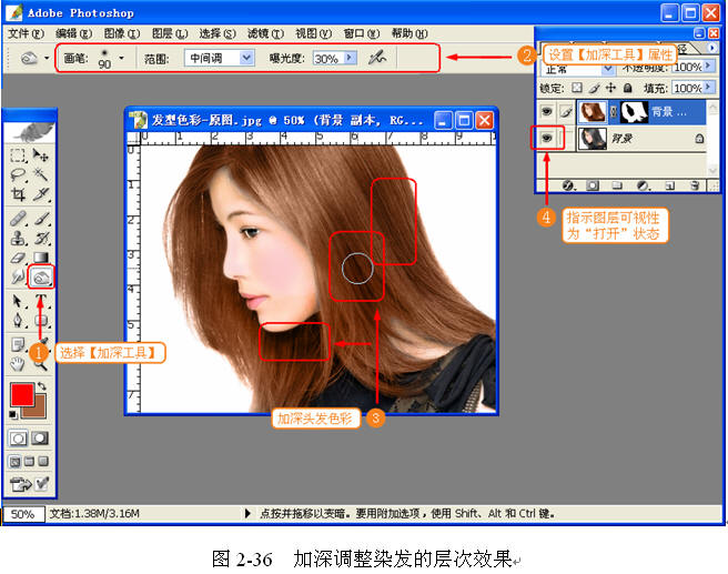 (6) 加深调整染发效果。使用【加深工具】调整染发的层次效果,如图 2-36 所示。