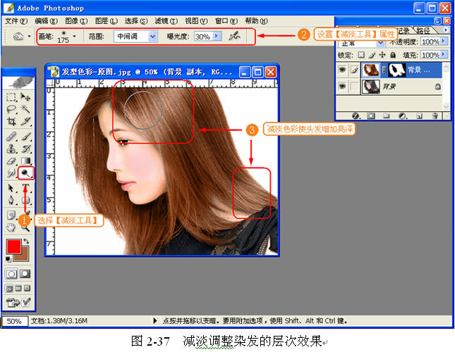 (7) 减淡调整染发效果。使用【减淡工具】调整染发的层次效果,如图 2-37 所示。