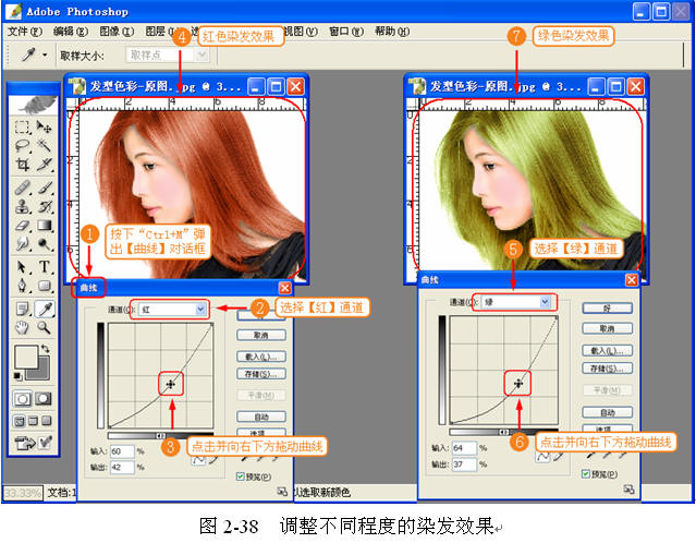 (8) 制作不同程度的头发色彩。使用【曲线】功能调出不同程度的染发效果,如图 2-38 所示。