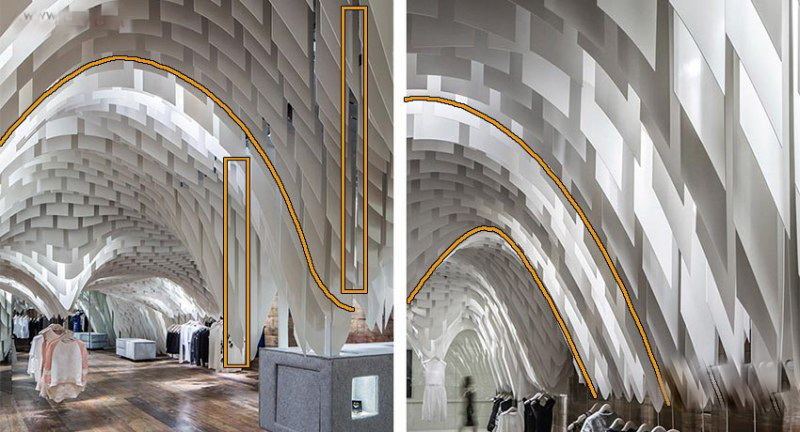 总设计师Francesco Gatti:"当我开始这个店铺的设计构思时,我只有一个简单却又引人入胜的想法,那就是所有的室内设计元素都将“从天而降”- 因此顾客将有充足自由的购物浏览空间而不被一般店铺底面中所摆放的家具和销售单品所阻碍。首先我们使用一个模型软件来模仿用材的物理特性,创造出一个可拉伸有张力的天花吊顶仿佛真实地被各类物件的重量所影响从而垂坠了下来。其次我们考虑到了店铺中所必须的一些设备例如照明、音响、消防喷淋、摄像头、空调和通风等,所以“可渗透”型的半开式吊顶外观想法则理所应当的浮出了水面。以上则是垂坠吊顶的创作本意,好似对转瞬即逝商品的片刻拥抱支撑。"