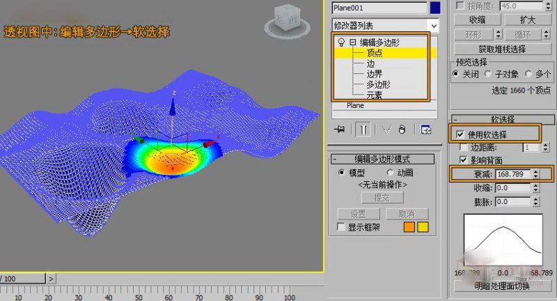 第二步,转到透视图中,给模型添加“编辑多边形”命令。在点级别下,勾选软选择,把软选择中的衰减加大,越大软选择的区域越大,然后选择不用的区域进行向下拖拽。如图: