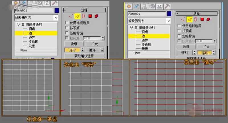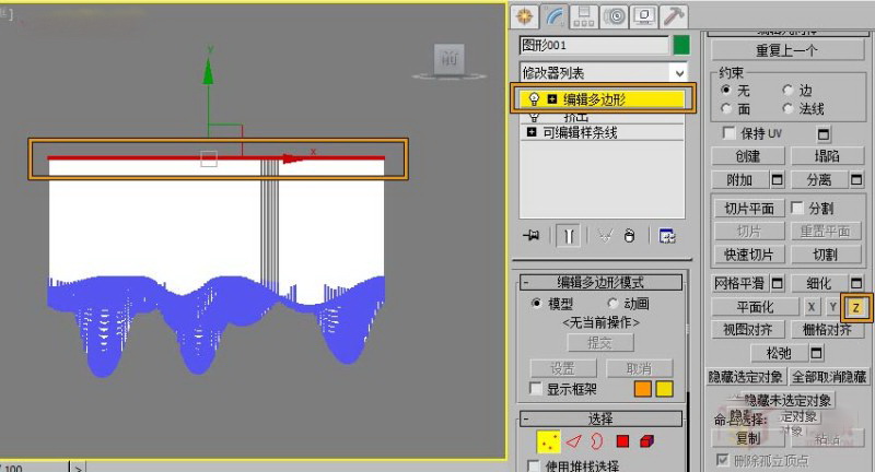 此时我们将模型的顶部进行平面化,这里将模型顶部平面话有两种方法,一种方法我在以前的教程中有提到过。另一种方法我们给模型一个“编辑多边形”命令,选择顶部所有的点,找到平面化命令点击“Z”。如下图:
