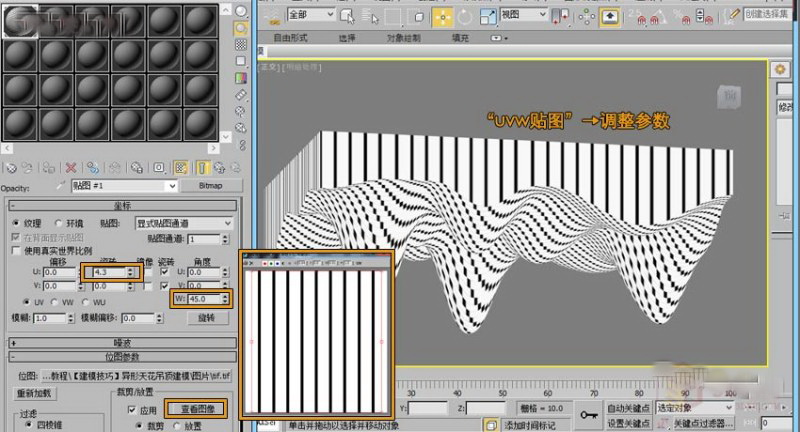 第三步,就是调整贴图了,在调整的过程中,我们都知道“黑透白不透”,调整的过程中,我们结合着贴图的参数及给模型一个“wuv贴图”命令来一起调整,黑色部分控制我们所需要的缝隙大小。