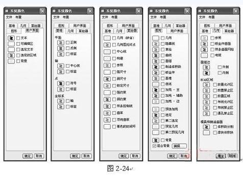 在菜单栏中选择【视图】|【显示设置】|【系统颜色】命令,系统将弹出【系统颜色】对话框,用于设置系统环境和各图元显示颜色,如图2 24所示。