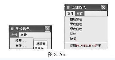 另外,在【系统颜色】对话框的顶部还有【文件】菜单和【布置】菜单,如图2 26所示。在【文件】菜单下有【打开】和【保存】两个命令。
