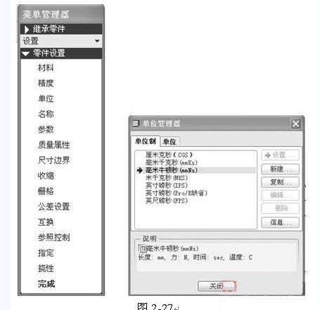 pro/engineer提供了7种预定义单位系统,其中一个是默认的单位系统(如图2 27的【单位管理器】对话框中所示)。可以更改指定的单位系统,也可以定义自己的单位和单位系统(称为定制单位和定制单位系统),但不能更改预定义的单位系统。