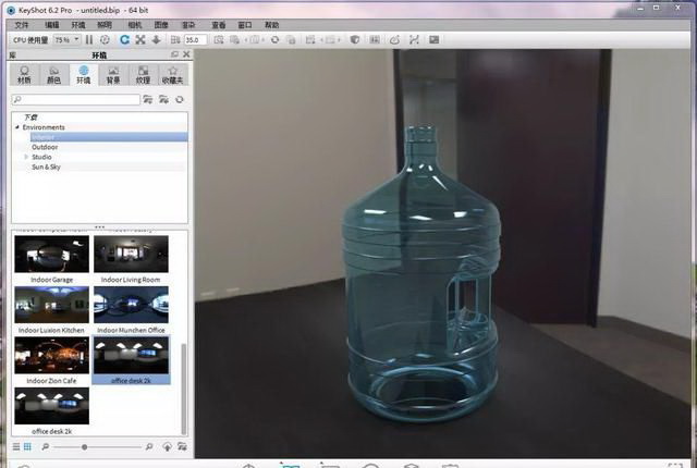 这个渲染软件是完全基于CPU的3D渲染软件,渲染时3D数据存储在内存里而不是显存里,因此可以导入非常大的数据量的模型,而不需要一个强大的独立显卡。当KeyShot 渲染的时候,它需要使用电脑的100% CPU,这很正常,但有时可能会出现很卡的现象。不过在左上角可以调CPU的使用率。当然如果有一张不错的显卡,也可以勾选后GPU开启GPU来帮助渲染。