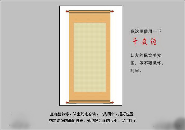 分享一篇PS绘图教程,教你Photoshop绘制漂亮的古画卷轴方法,不是什么图都装裱了好看啊,记着。我借用了千夜潼坛友的图,要是有国画 会效果更好些。