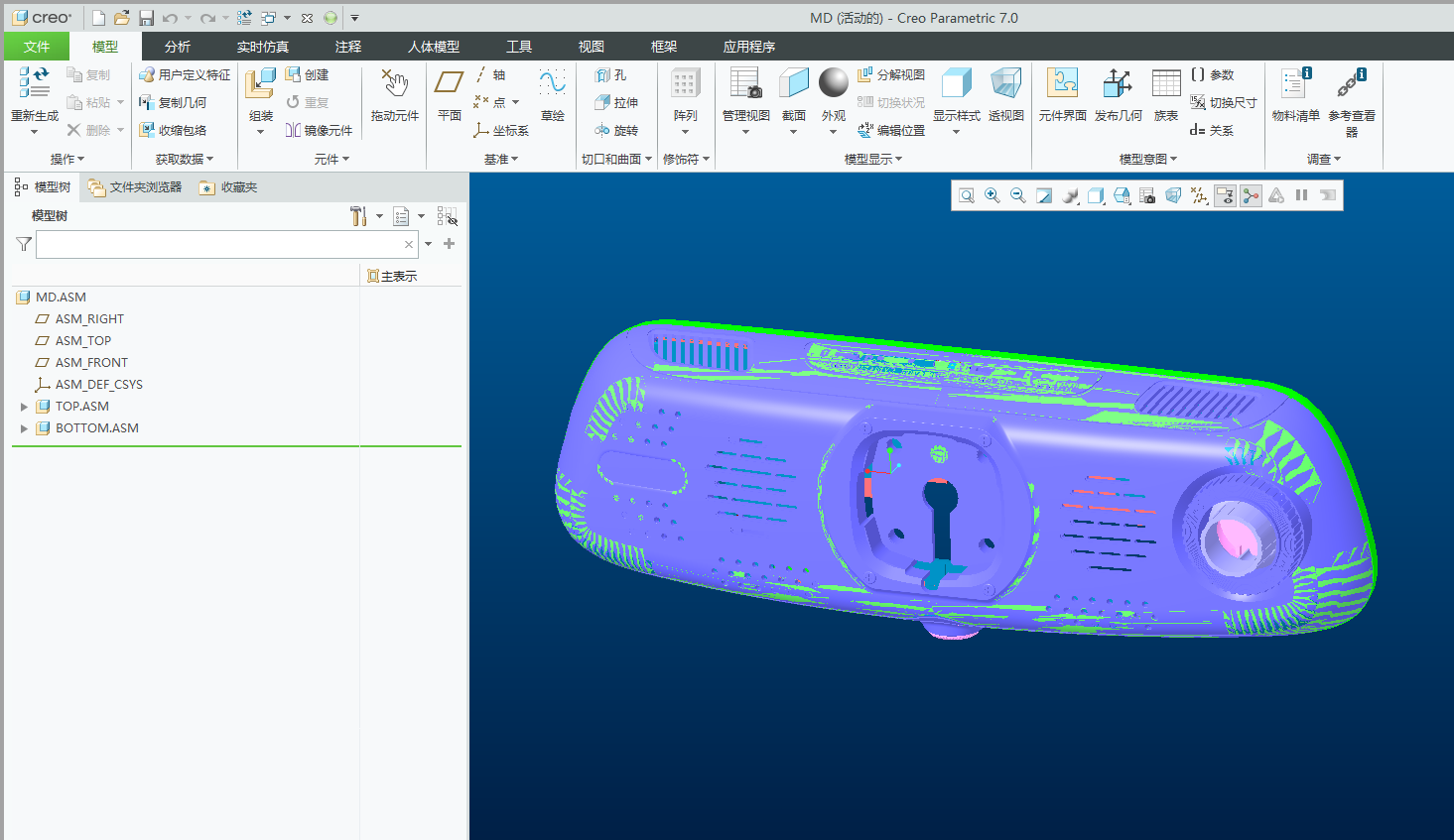设计举例:如下图所示的是一录音笔产品模型,该产品结构特点就是表面造型比较复杂呈流线型,各零部件之间配合紧密,但是各部件上很多细节尺寸是无法得知的,像这样的产品就可以使用自顶向下的方法来设计。