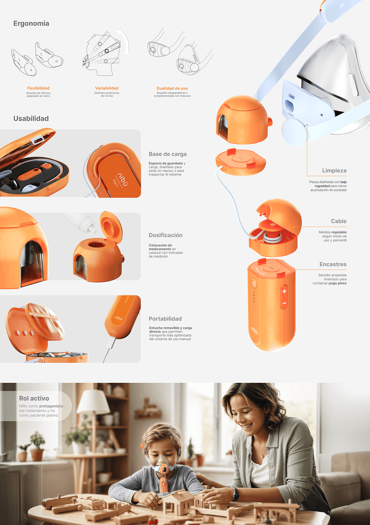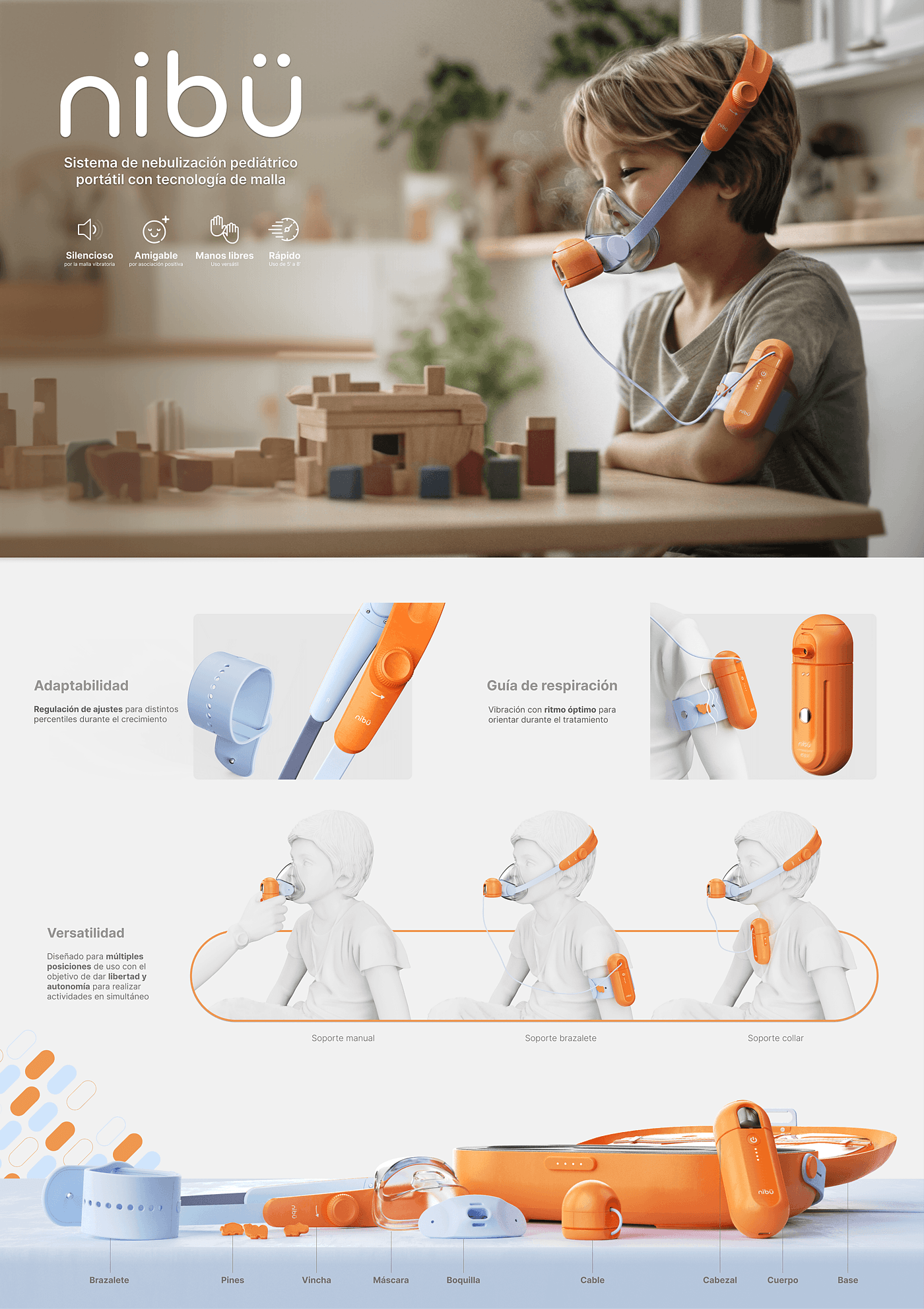 NIBÜ 是一款便携式儿童雾化器医疗产品设计,专为儿童而设计,便携设计解决了儿童用户雾化的医疗需求,尤其适合需要随时随地治疗各种上下呼吸系统疾病的儿童,比如常见的感冒发烧咳嗽,为儿童的健康保驾护航。