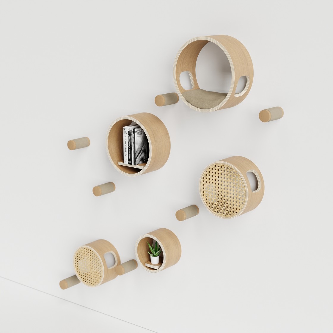 Bubbles 是一系列的猫咪宠物嬉戏玩耍休闲工具用品设计,所有部件产品都是由天然材料制成的,如弯曲的胶合板、甘蔗和织物,切合猫咪宠物活泼好动的天性,同时还能参与到家居装饰当中。