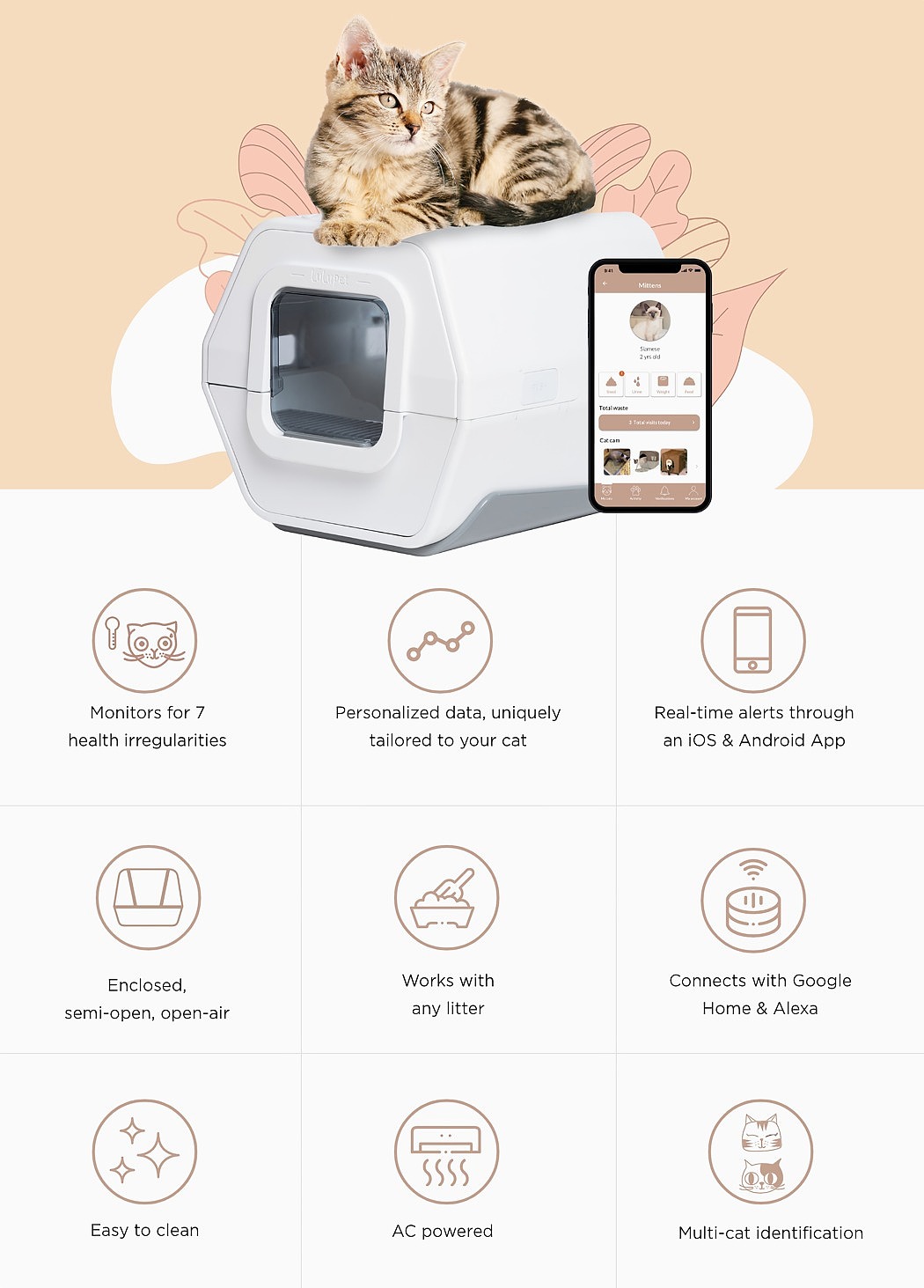 LuluPet 是一款智能猫砂盆产品设计,专为猫咪健康而设计,它使用排泄物图像识别技术来追踪你的猫的健康状况,借助人工智能AI来识别问题,其内置摄像头、红外传感器和人工智能芯片来分析不同类型的粪便。