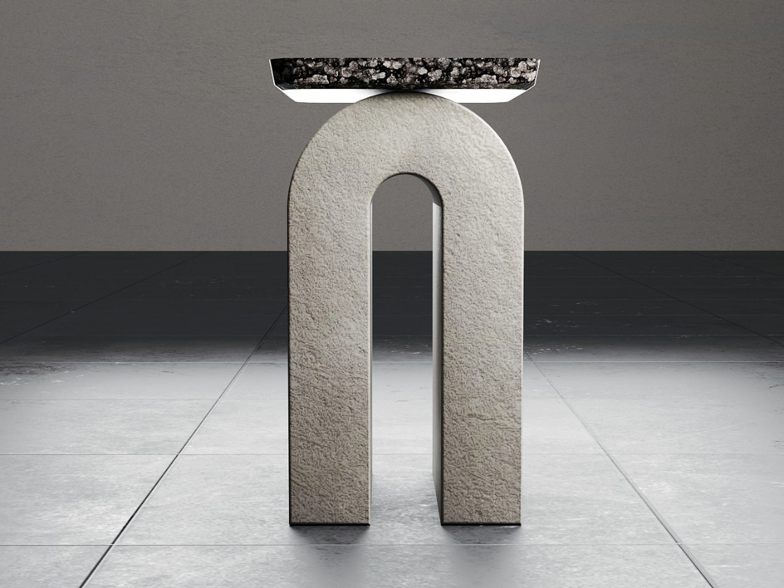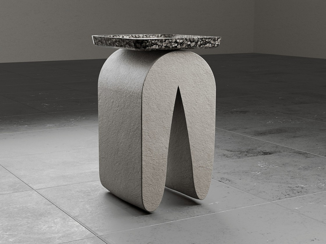 这是一款混凝土应用家具产品设计美学设计,一款概念石头边桌。其应用了混凝土与大理石两种材料设计,底座是混凝土材料,而上面的托盘则为大理石材料,看似摇摇欲坠,实际上稳如泰山,有那么一丝视错觉设计感。