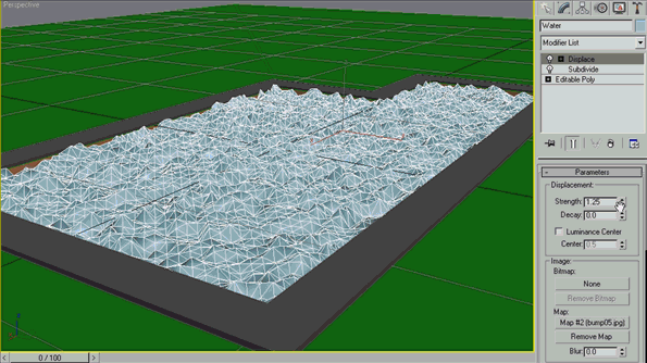 现在,让我们把水的多边形位移修改,使其看起来像水体,可以起到与参数,以获得最佳的效果,否则你只是在下面的图像中输入参数。 |