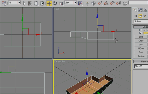 选择地面样条,然后去顶视图,并取消在花键,然后取消勾选(开始新图形),现在你必须创建一个矩形,如下图所示. |