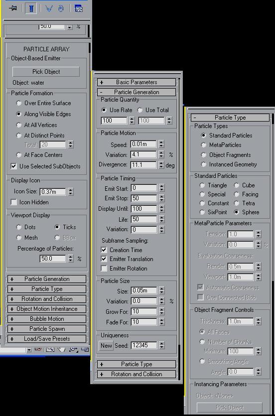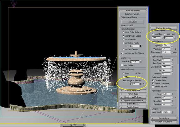 8,我们已经完成了喷泉的水,从开始,直到它落下的水的池塘。现在从喷泉的水必须不是所有的下山直接的下表面,它必须存储在石喷泉,直到它溢出来池塘。要解决这些,我们将创建另一个粒子,现在冻结所有其他对象和解冻模型水性顶。它是存储在石喷泉水。然后在命令面板浏览粒子系统,然后形成列表中选择“粒子阵列”。