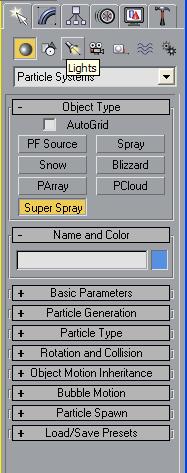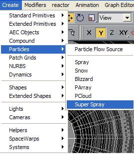 2,粒子系统创建命令面板,浏览,然后选择“超级喷雾。或者从菜单栏,选择“创建”,然后浏览颗粒,然后超级喷雾。