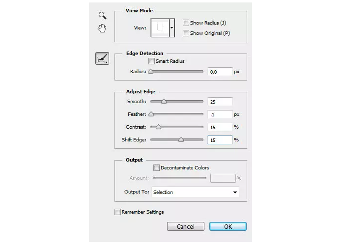 这些设置将对选区进行调整,你也可以根据自己的图片进行设置,看看它们改变后到底会引起什么变化。