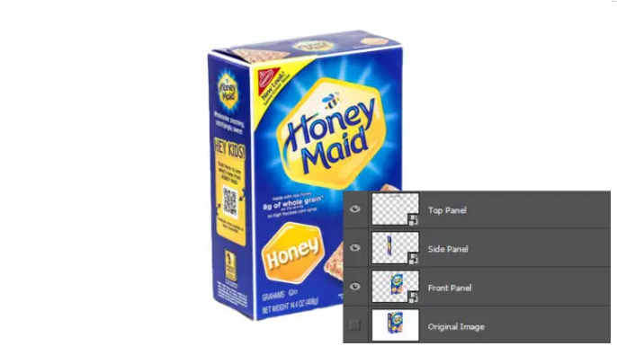将盒子的正面选中,按CTRL + X剪切,CTRL + SHIFT + V粘贴,这时盒子的正面还在原来的位置,只不过是在一个新的图层。右键单击图层面板上的该图层,将其转换为智能对象,然后把它隐藏起来。重复这个过程,将侧面和上方的面剪切到新图层,要确保将它们转换为智能对象。