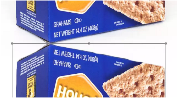 4、创建一个新图层组并命名为“倒影”。把上述3个单独的智能对象的图层移动到这个图层组。选中图层组,然后按CTRL+ T进入自由变换模式。右键单击画布并选择垂直翻转。显示原始图层,拖动图层组至盒子的下角与原始图层盒子的下角重合,然后按下Enter。如图。