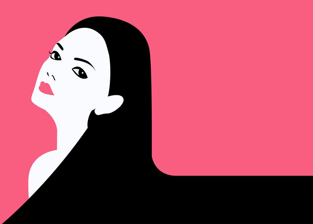 为画面增加背景色,这个背景色与唇色呼应。让色彩显得干净。基本的填色完成后,大致的人物形象就一目了然,在此进行对五官细节的微调,将是更进一步的“符号化”的过程。