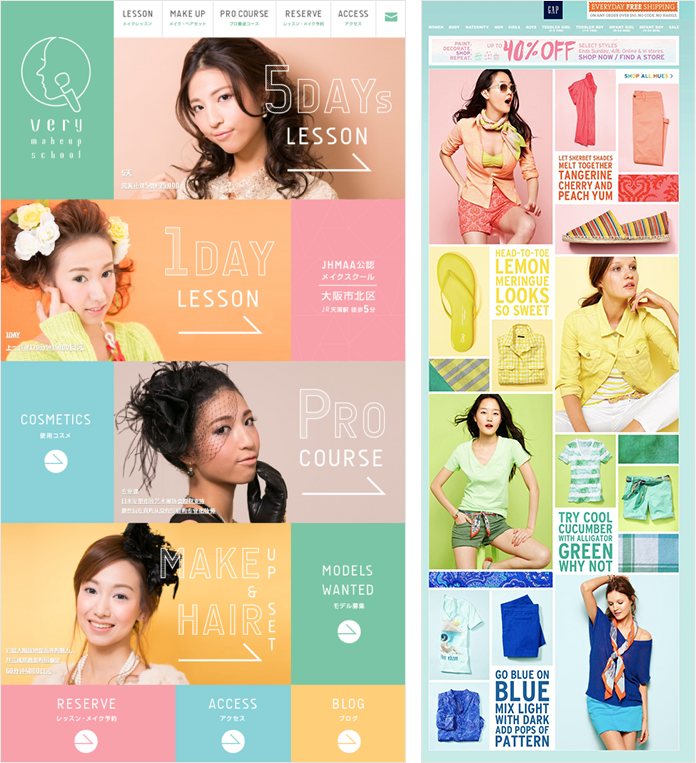 这是由同一色调构成的统一性配色。深色调和暗色调等类似色调搭配也可以形成同样的配色效果。即使出现多种色相,只要保持色调一致,画面也能呈现整体统一性。
