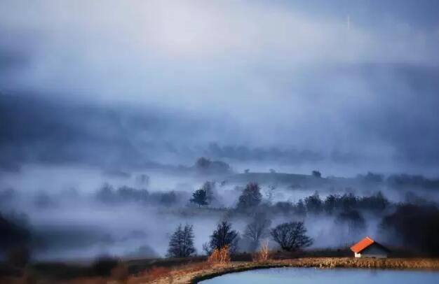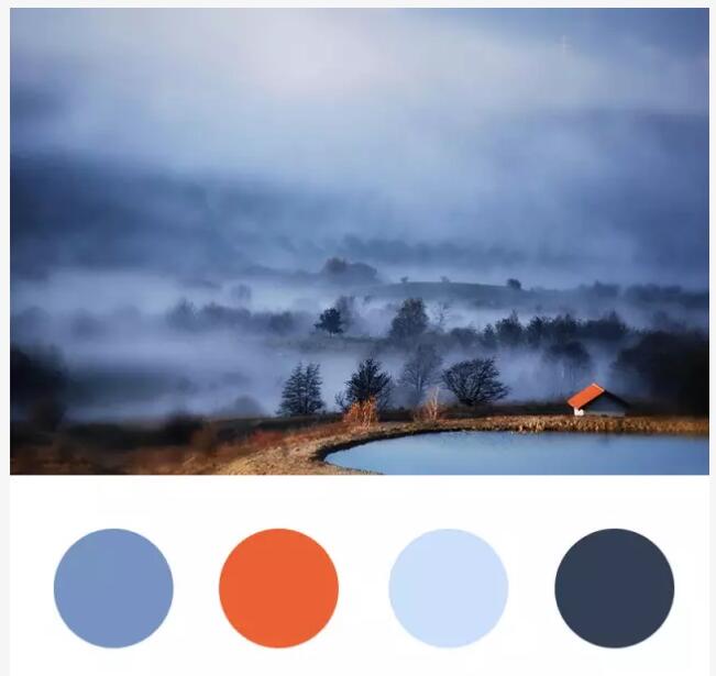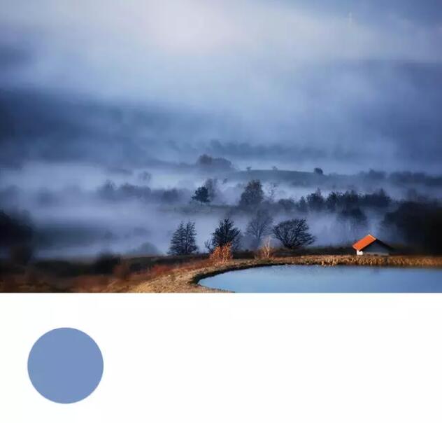 主色调的选择依据整个图像当中分布最广的一种颜色,在这张图片中,我们可以看出分布最广的为蓝色,这些蓝色呈现明暗层次深浅的不同,因此,在深蓝到浅蓝中我选择了过渡最为均衡的一种中度灰的蓝色。这种蓝色在图片上表现的是一团团云雾和湖泊的颜色。