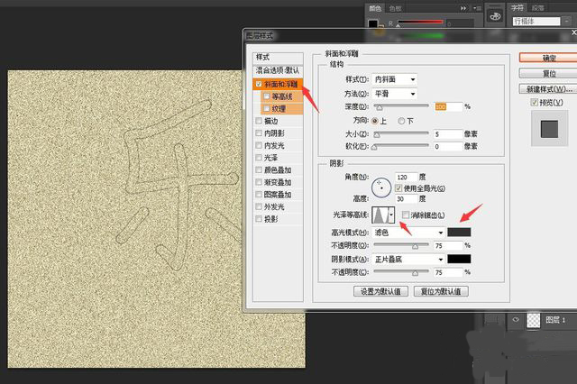 5、对图层2执行“图层-图层样式-斜面和浮雕”,将光泽等高线设置为“环形”,高光模式颜色为深灰色。其他设置不变。