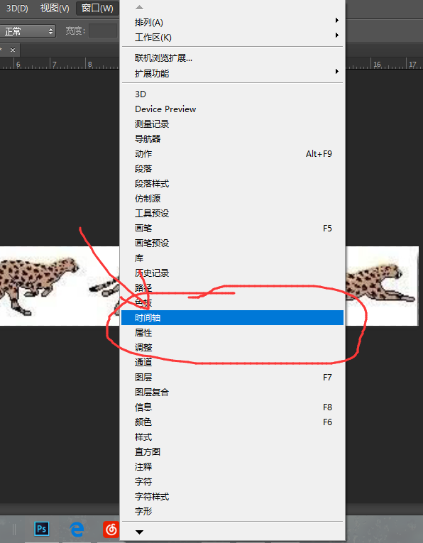 在窗口里找到时间轴选项,点击时间轴选项,再其面板内找到创建帧动画选项;