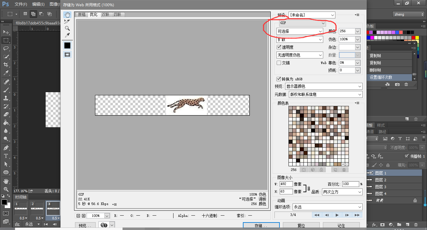 用快捷键Alt+Ctrl+shift+S打开web所用格式选项击存储为web所用格式选项,在弹出的对话框内设置格式为GIF后点击确定,这样就制作好了动画。