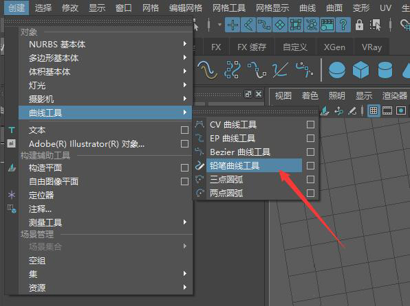 1、首先,点击创建菜单-曲线工具-铅笔曲线工具,进入铅笔曲线绘制模式。