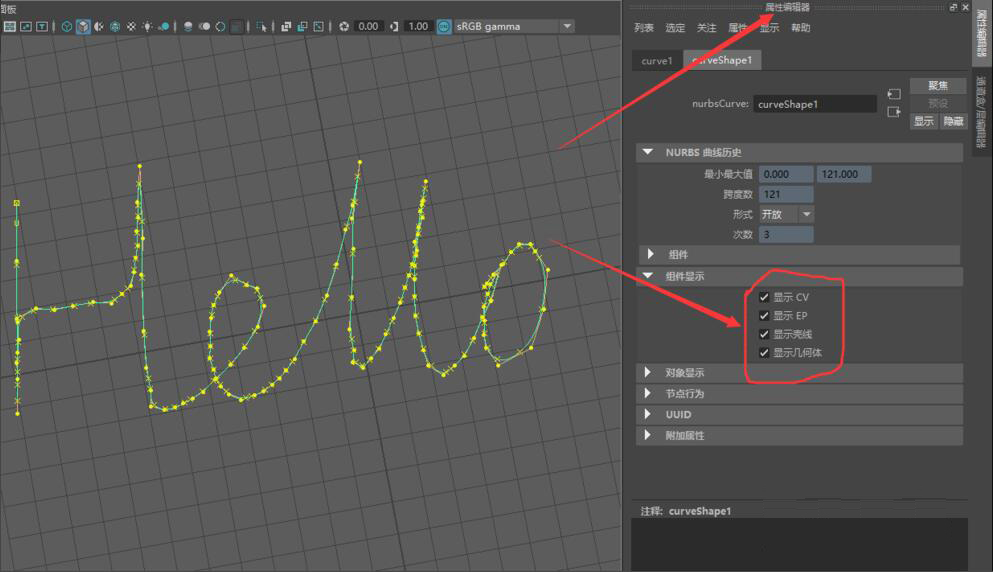3、在对象模式,选中这跟曲线,在右侧打开属性编辑器,展开组件显示,我们可以看到显示CV,显示EP,显示壳线,显示几何体四个选项。我们可以勾选他们。