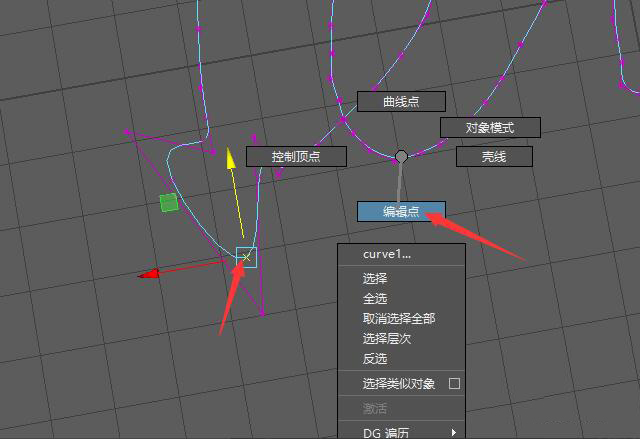 5、第二种是右键,拖动鼠标到编辑点菜单上,然后选择曲线上的一个或多个EP点通过移动/旋转/缩放工具进行位置编辑。